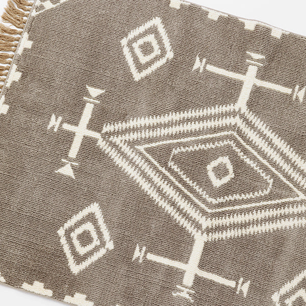 落ち着いた色味で、インテリアのテイストを選ばず馴染みながらも、しっかりとした個性を主張します。視覚的にも手触り的にも、空間に温もりと奥行きをプラスしてくれる一枚。飾るように使えるマットとして、日々の暮らしにさりげない豊かさを添えてくれます。