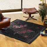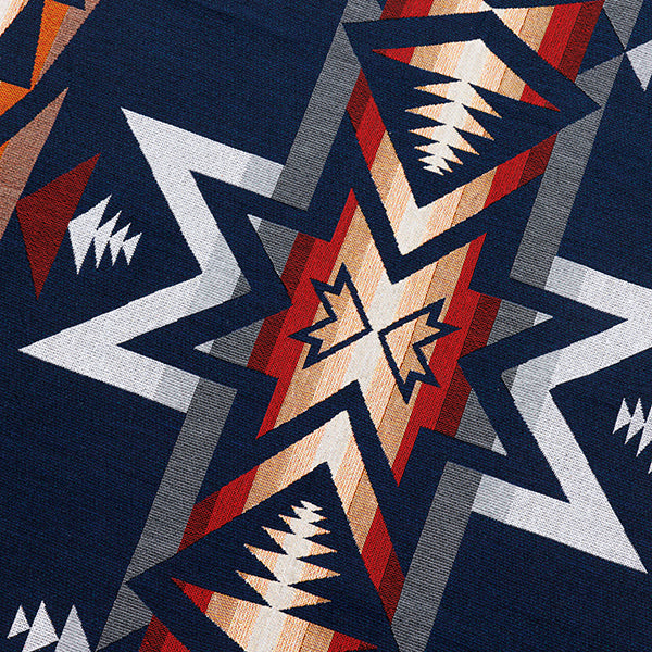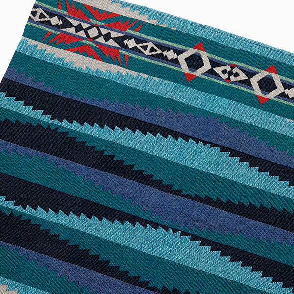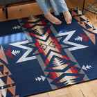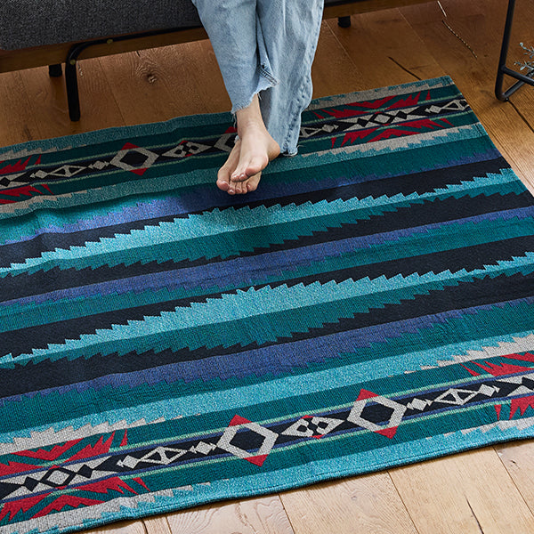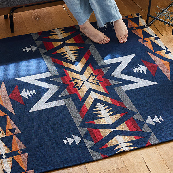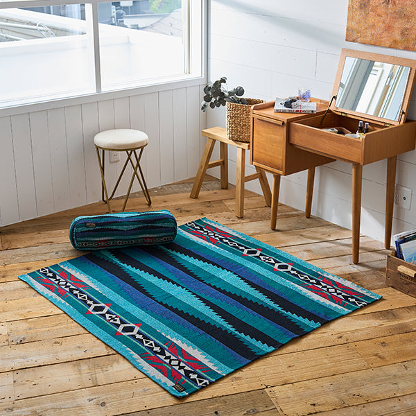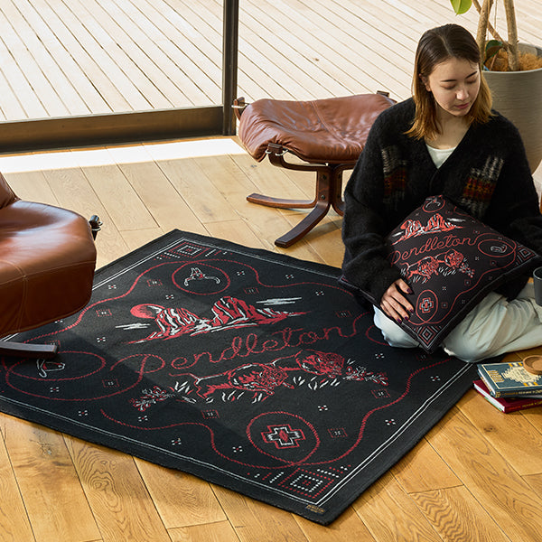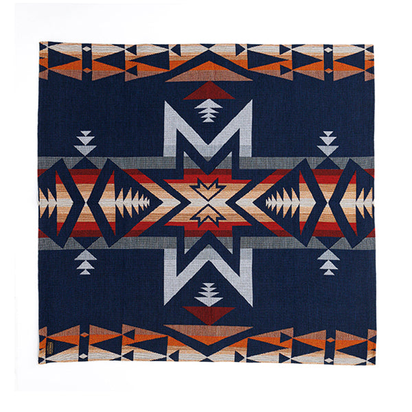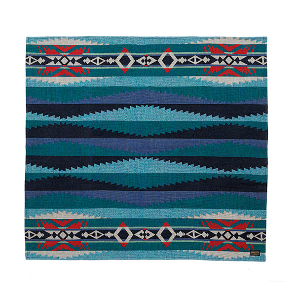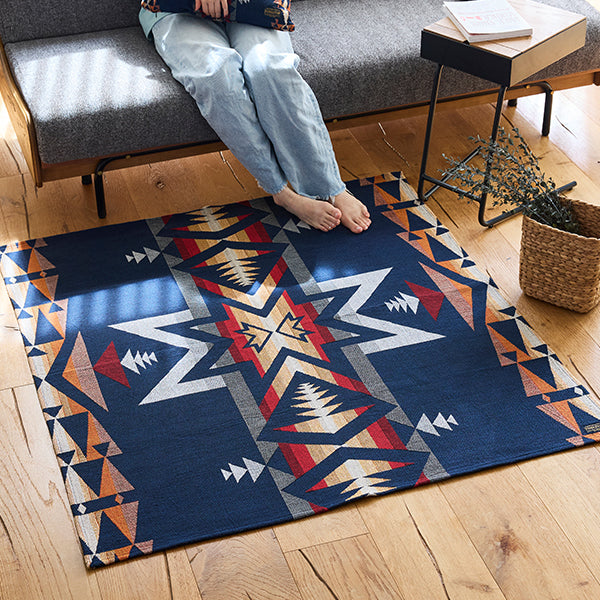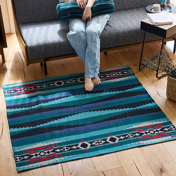 ペンドルトン独自のネイティブ柄が鮮やかに織られた、美しいジャカード織のラグ。130cm×130cmの正方形で、リビング、寝室などでインテリアのアクセントになる1枚です。裏面には滑り止めが付いています。