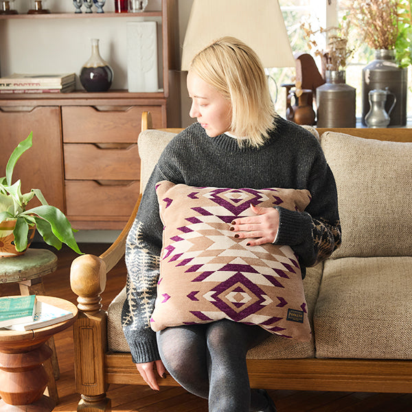 肌触りのやさしい高級感のあるクッションカバーは、落ち着いたトーンでどんなお部屋にも自然と馴染むアイテム。おそろいのラグと合わせてソファやベッドに置けば、空間に上品さとくつろぎ感をプラスします。ペンドルトンの美しいパターンが、毎日の暮らしに上質な彩りを添えてくれます。