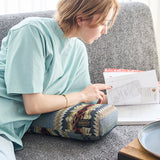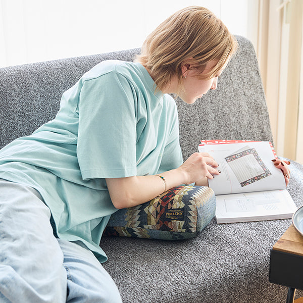 腰を支えるように緩やかにカーブしているピローは、長時間の座り作業やリラックスタイムにお勧めです。背もたれのある椅子に座る際に背面に置くことで姿勢を正しくサポートします。机でのお昼寝の際に枕代わりに使ったり、ソファーで読書の際に膝に置くにもちょうど良い高さです。独自のネイティブ柄が美しくデザインされたジャガード織りを採用しており、実用性だけでなくインテリアのアクセントとしても優れています。オフィスチェア、ソファ、車のシートなどさまざまなシーンでお使いいただけます。