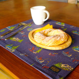 サーフボードを積んだ車や貝殻、浜辺からのサンセット 、森に張ったテントやカヌーに乗って釣りをする人、パドルに松ぼっくり・・・アウトドアを感じさせる柄がお食事の時間を楽しく演出します。