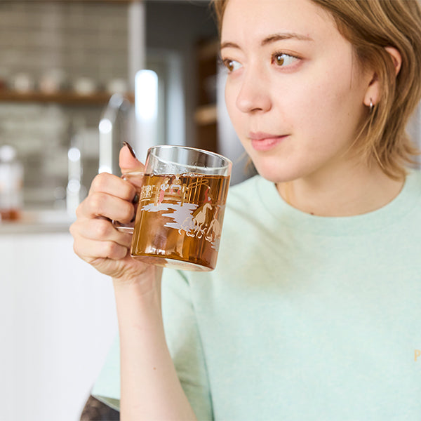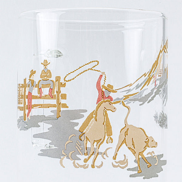 ロデオがアイコニックに描かれたガラス製のマグカップには、どんなドリンクを入れましょう。アメリカ西部に多く見られるRanch(家畜の放牧をしている牧場)でカウボウイが牛を追っている広大な牧場に牛乳を入れて雪景色にしたり、濃いめに入れた紅茶もいいかもしれません。薄くて軽量ながら耐熱性に優れていますので冷たい飲み物はもちろん、温かい飲み物もお楽しみいただけます。ガラス特有の清涼感ながら、温かいドリンクも楽しめる、一年中愛用していただけるマグカップです。
