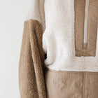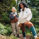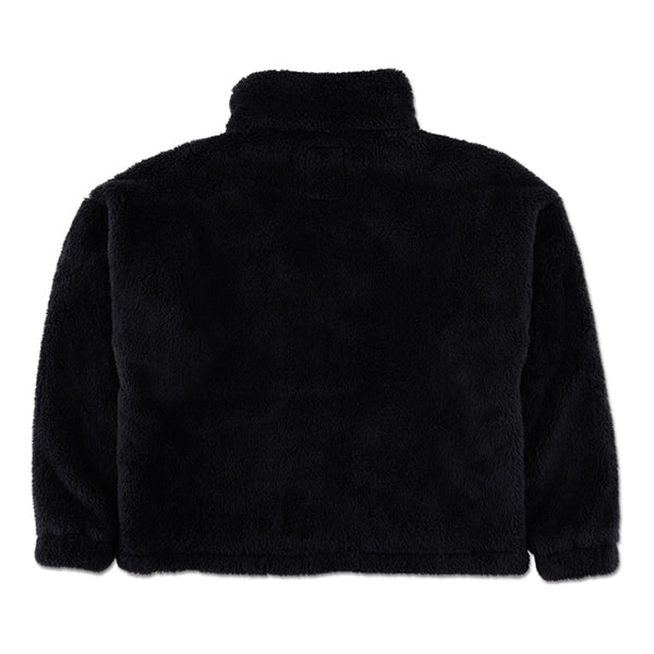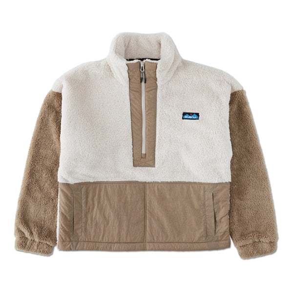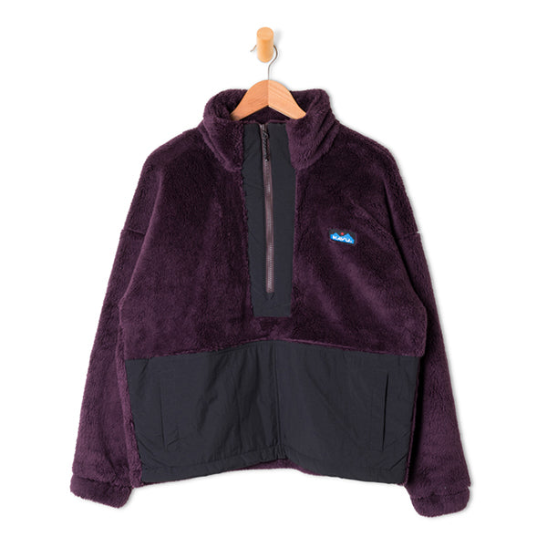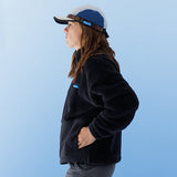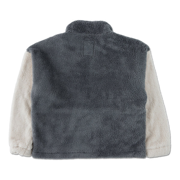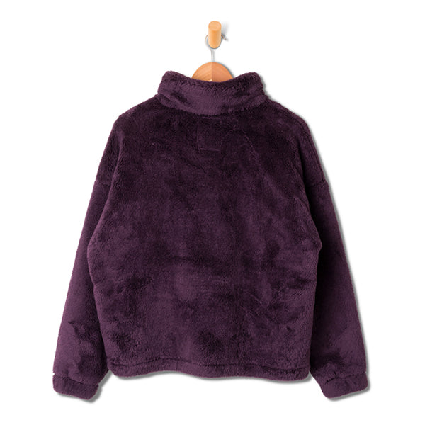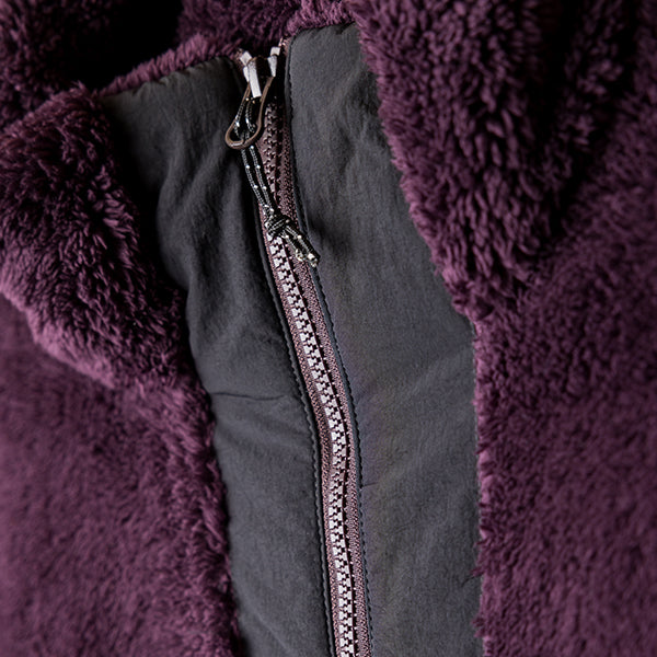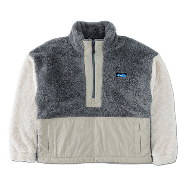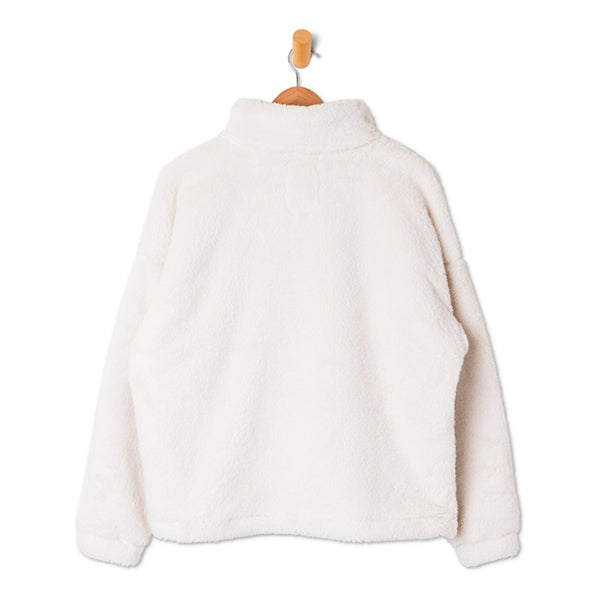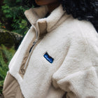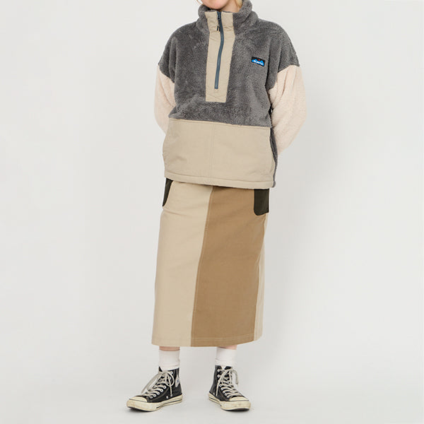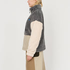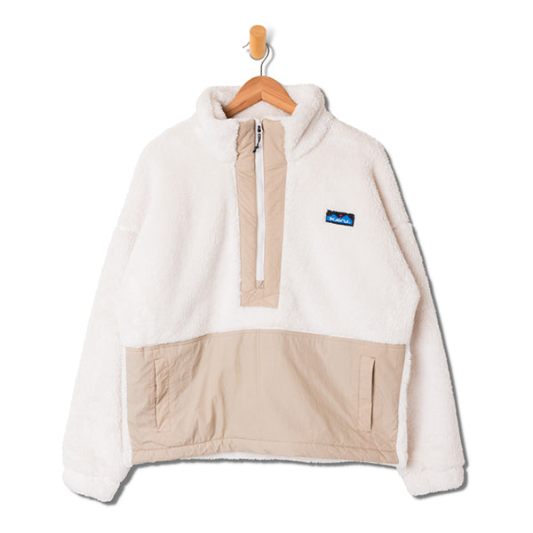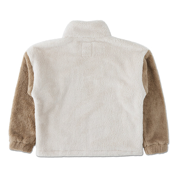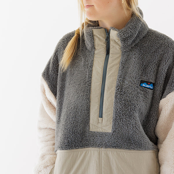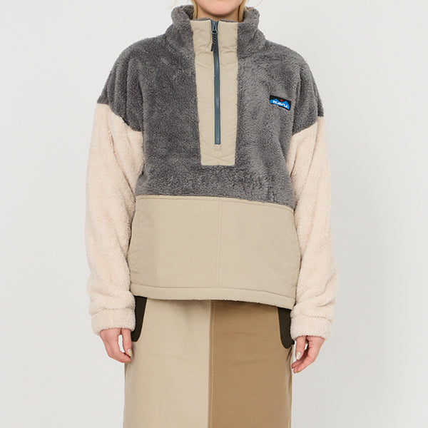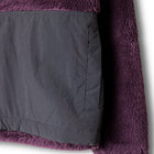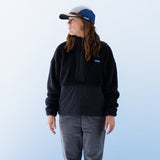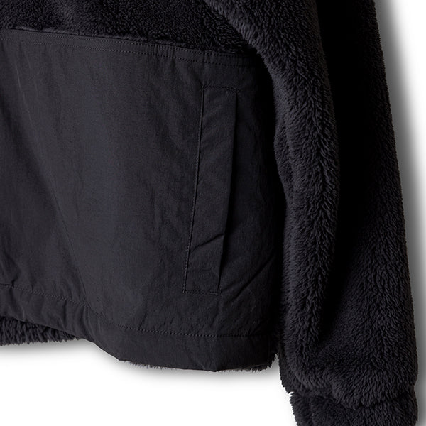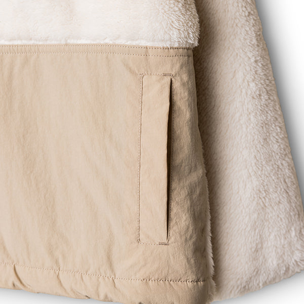 リサイクルポリエステル素材をを使用したフリースのアノラック。フードと裾野トリムがちょっとレトロな雰囲気です。裾は少しラウンドしていて、1枚羽織ればかわいいアウトドアミックスコーデの完成です。フロントはボタンを外せば大きく開くのでヘアスタイルの乱れも気にせず着脱することができます。