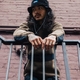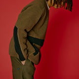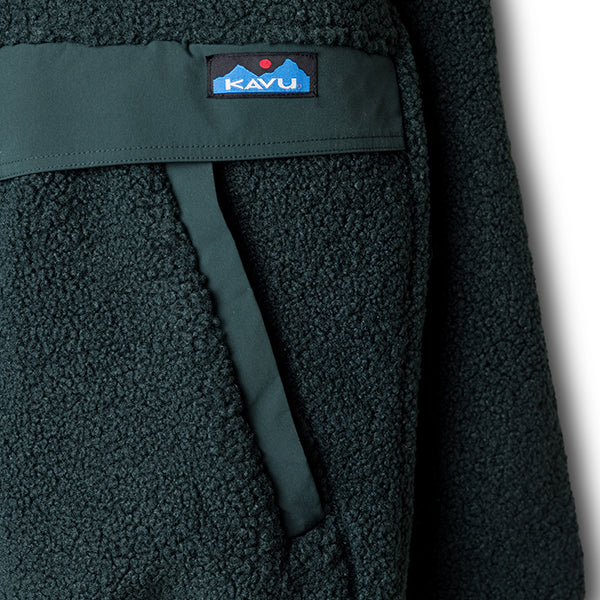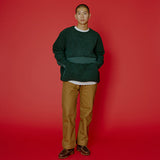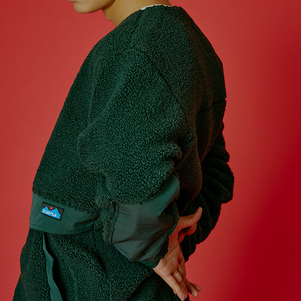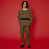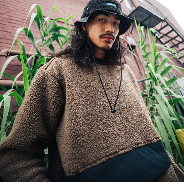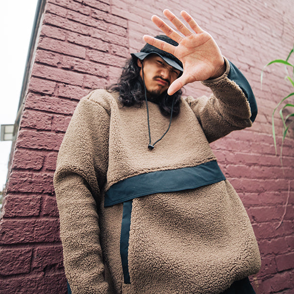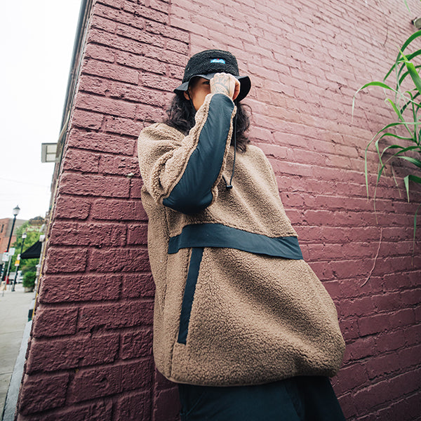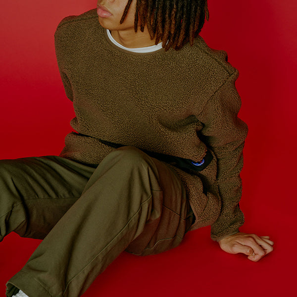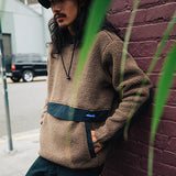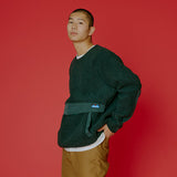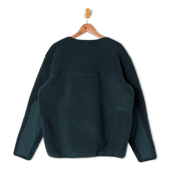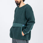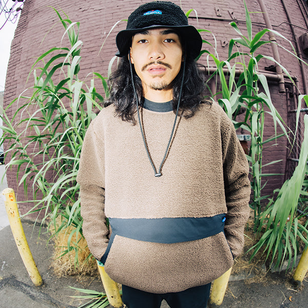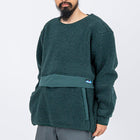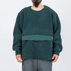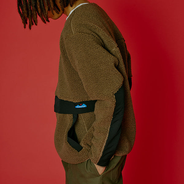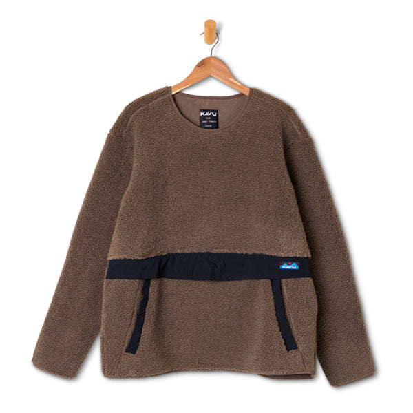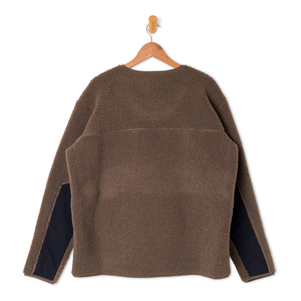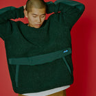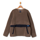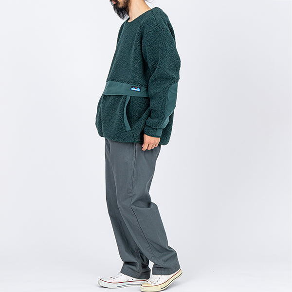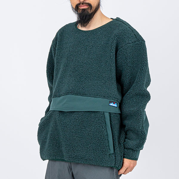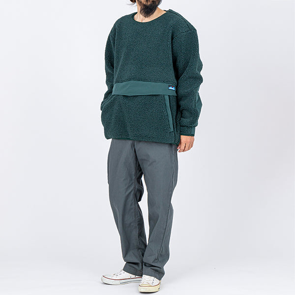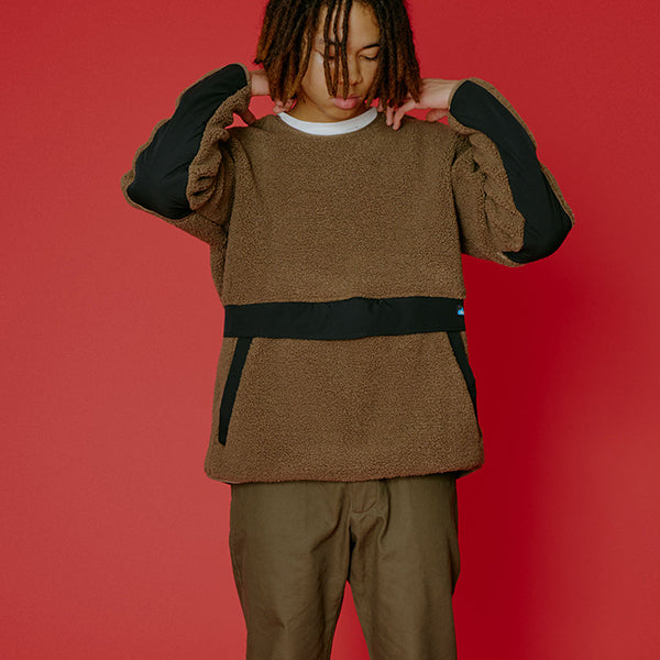 ゆったりとしたシルエットの被りのフリース。首元はすっきりとしたクルーネックなので、着脱もスムースです。フロントに異素材の切替とカンガルーポケットをデザインしてアクセントに。どちらもボトムを選ばない落ち着いた2色展開です。
