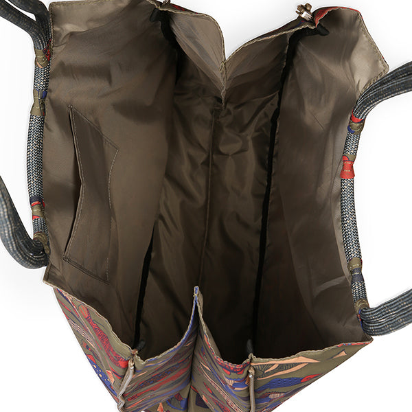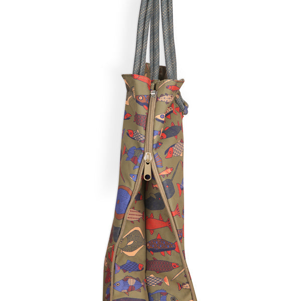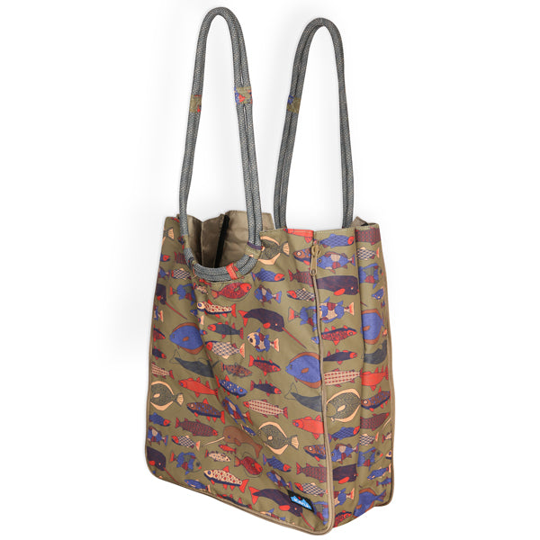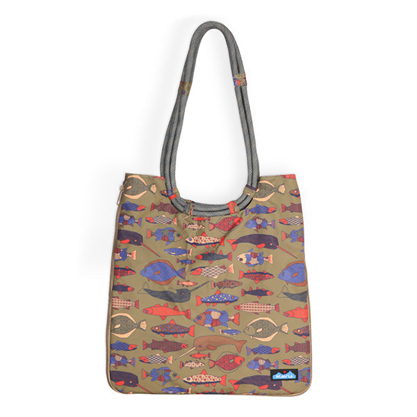 バッグの両サイドから底面までぐるっとジッパーがついていて、閉めればマチが小さいトートバッグに、開ければマチの広いトートバッグになるので用途に応じて使い分けられます。ハンドル部分はカブーらしいロープ素材で、肩にかけられるくらいの長めの設定なので重い物の持ち運びで手が疲れることもありません。また、片方のロープを肩にかけたままバッグの中の物を出し入れできます。素材は耐水性のあるポリエステル素材でできているのでお買い物バッグとしても、ビーチに遊び行くときの水着やタオルの持ち運びにも最適です。