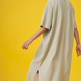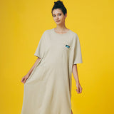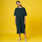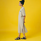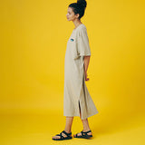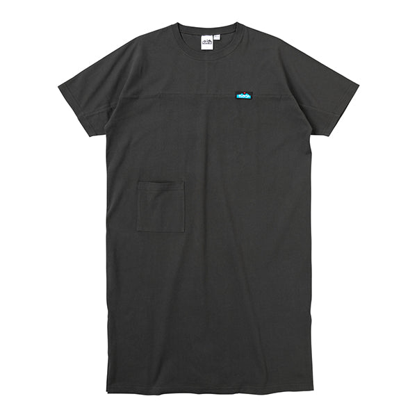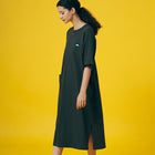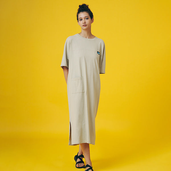 ボディーラインを拾わない、ゆったりとしたフォルムの、コットン製で着心地の良いワンピース。肩回りもゆとりがあり、裾にはひざ下くらいのスリットが入っているので、動きやすさと脚の細見せにも効果的です!フロントにはポケットをつけました。ワンピースもポケットがひとつあると、ほんとに便利ですよね!休日は朝から何も考えずに、このワンピースに袖を通して1日を始めてみてください!旅行や、キャンプ、日常のリラックスにお勧めな1枚です。