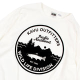 五分袖が1枚あると、コーディネートの幅がぐっと広がります。少しゆったりとしたサイズを選んでそのまま着ることはもちろん、カラーTeeにレイヤリングしても袖部分から必ずのぞくので組み合わせを気にする必要がありません。単調になりがちなTシャツの着こなしにちょっとアソビゴコロを加えてくれます。フロントにKAVUOUTFITTERSのサークルロゴをプリントしました。USAコットンを使用したボティで例年のワイルドライフベースボールTEEより少しオーバーサイズです。リピート購入の方はサイズチャートをサイズ選びの参考にしてみてください。