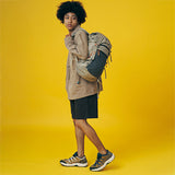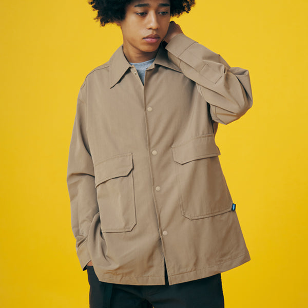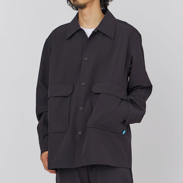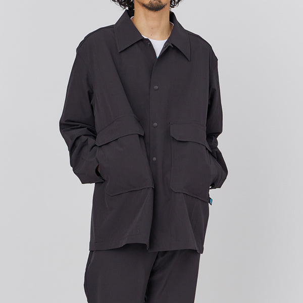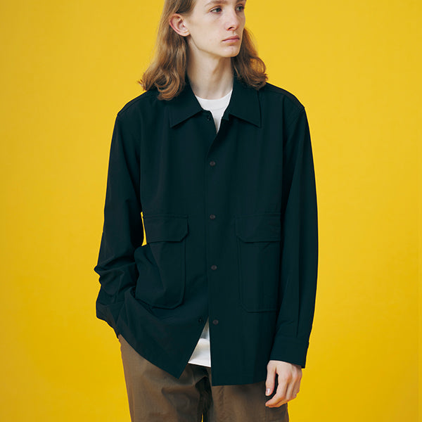 「太陽と遊ぶ」というコンセプトのもとSHELTECHは誕生しました。それは炎天下の中でも涼しく自由に動き回ることができる素材。【1.遮熱 2.接触冷感 3.吸水速乾 4.軽量 5.紫外線防止】の五つの機能全てを備えています。素材のもつ五つの機能が開発当初から全て意図されていたわけではありません。SHELTECHのもつその特殊な糸の成分と構造が、結果として軽量と紫外線防止という二つの副産物を産みました。それらは素材の活躍の幅をさらに広げます。もう一つの特徴はSHELTECHが様々な異なる素材との組み合わせに対応できることです。アプローチ次第で最終製品の可能性は無限大。ファッションからスポーツ、ワークウェアまで。太陽と遊ぶ。