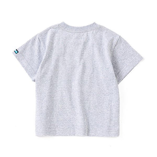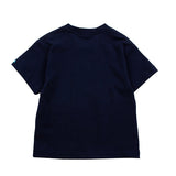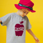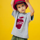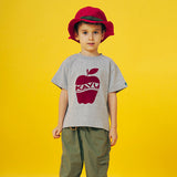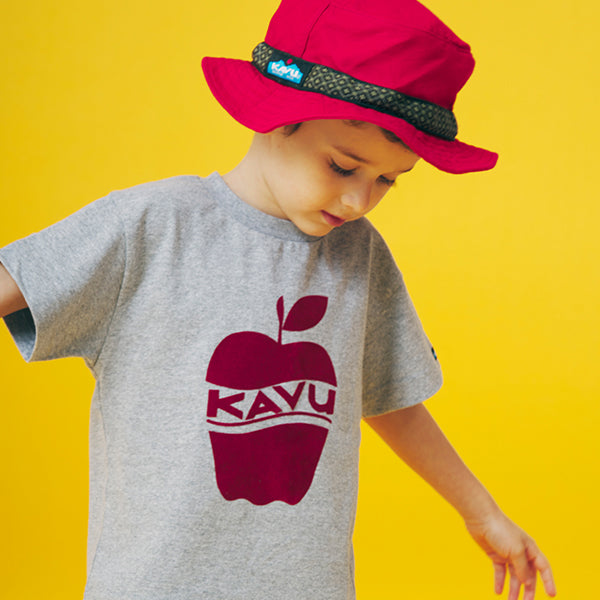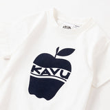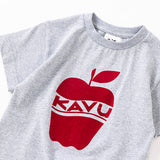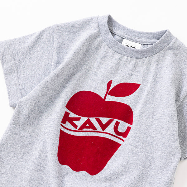 KAVUキッズのために、オトナとおそろいのTEEをご用意しました。おそろいを着て、さてどこに出掛けましょう!フロントにアップルがプリントされたTシャツにはベロア調のフロッキープリントを採用して、少しもこもこで立体的なプリントになっています。