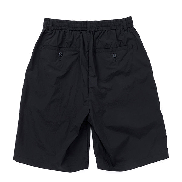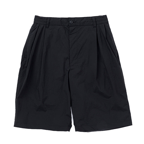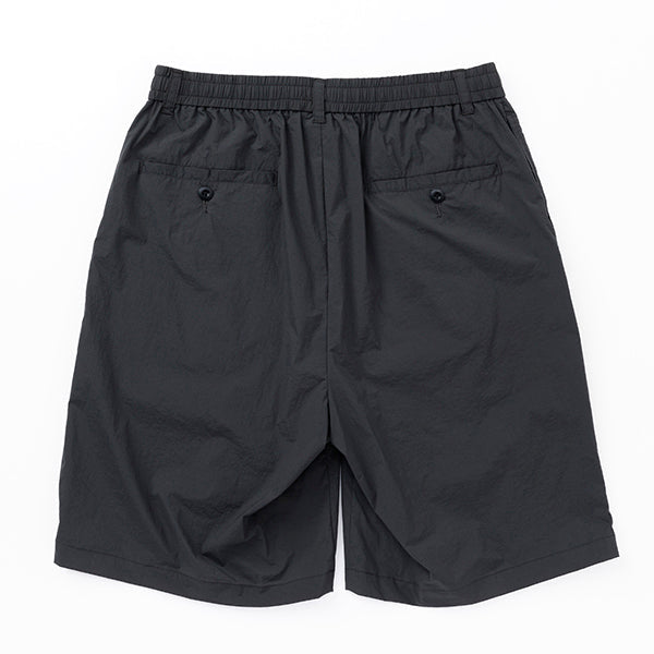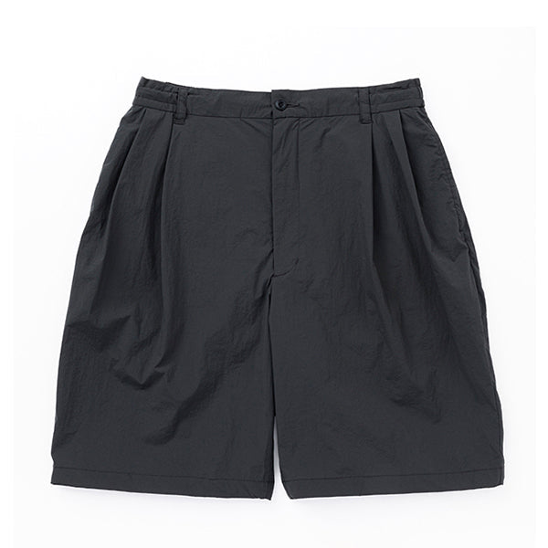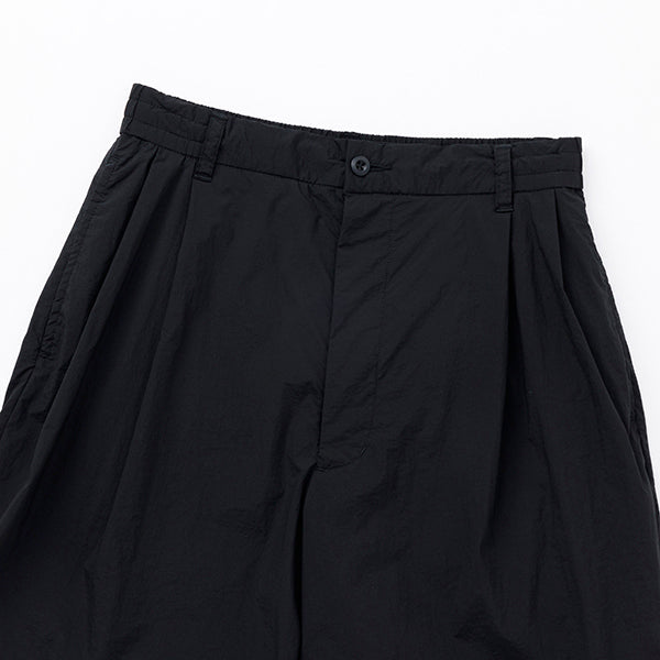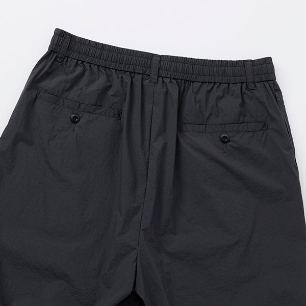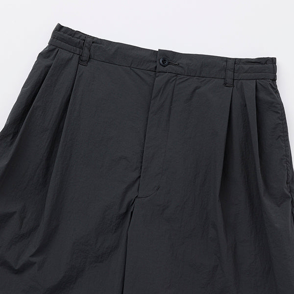 ベルト無しでもはけるイージーパンツ仕様で、20Dナイロンを使用した軽量で薄手のストレッチ素材を採用し、ドライなタッチとペーパーライクな質感が特徴で、見た目以上に軽やかな履き心地が魅力です。また、タック付きで幅広いシルエットが特徴で日常の快適な着用感を提供するだけでなく、幅広いスタイルにもマッチするアイテムです。
