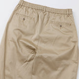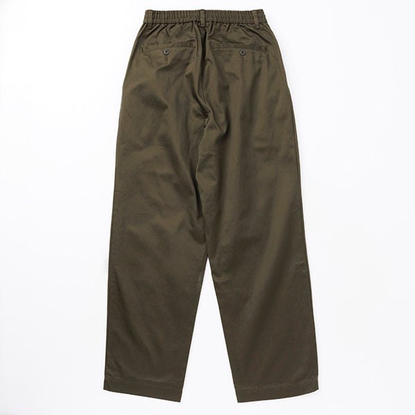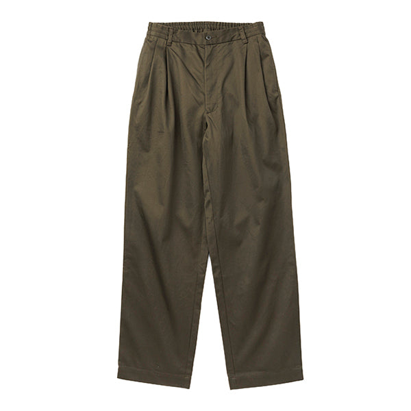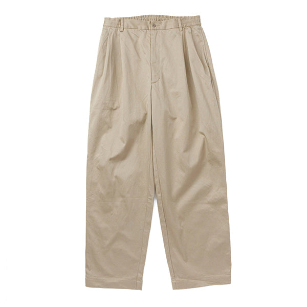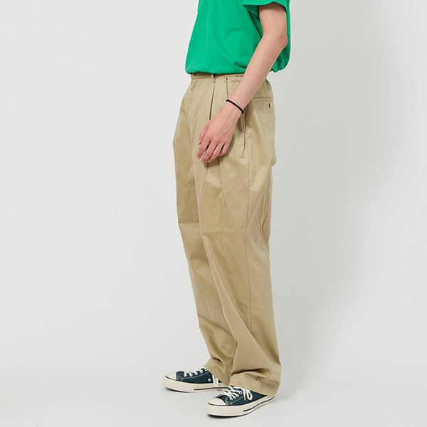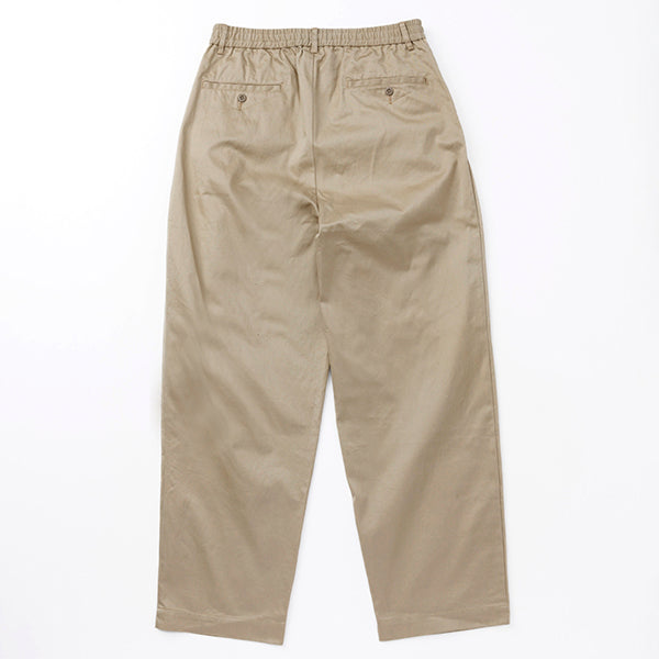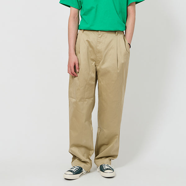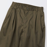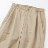 一般のチノクロスに比べ細い双糸を使い、綾織で高密度に打ち込んで独特の光沢となめらかなハリ感などが特徴のウエストポイント生地を使用し、耐久性に優れながらも快適な履き心地を実現しました。タック付きで幅広いワイドなシルエットが特徴のパンツでジャパンフィット(日本向けのサイズ)ですのでサイズ選びの参考にしてみてください。