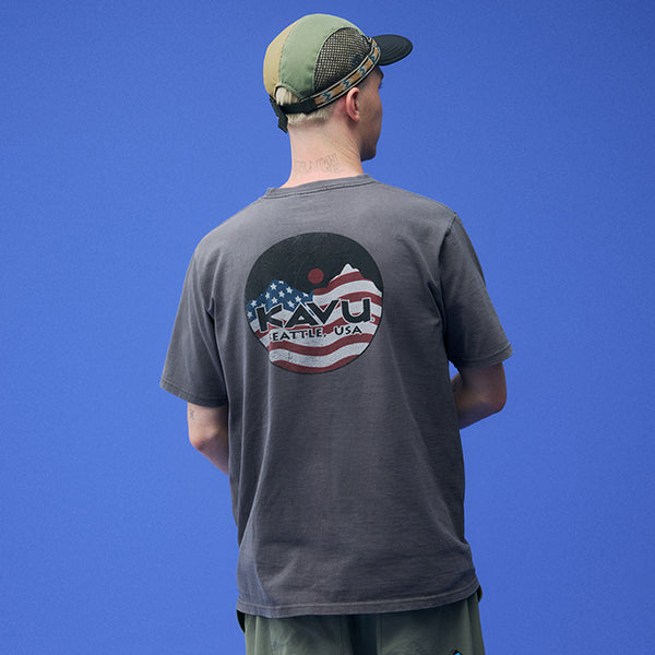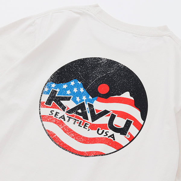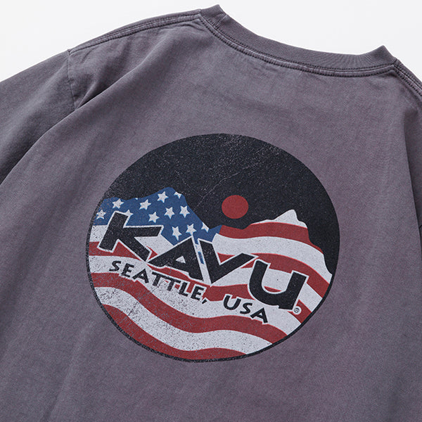 KAVUの定番、マウンテンロゴにThe Starsand Stripes(星条旗)を組み合わせたスペシャルなロゴTEEです!フロントにもKAVU好きをアピールするロゴをプリントしています。