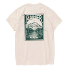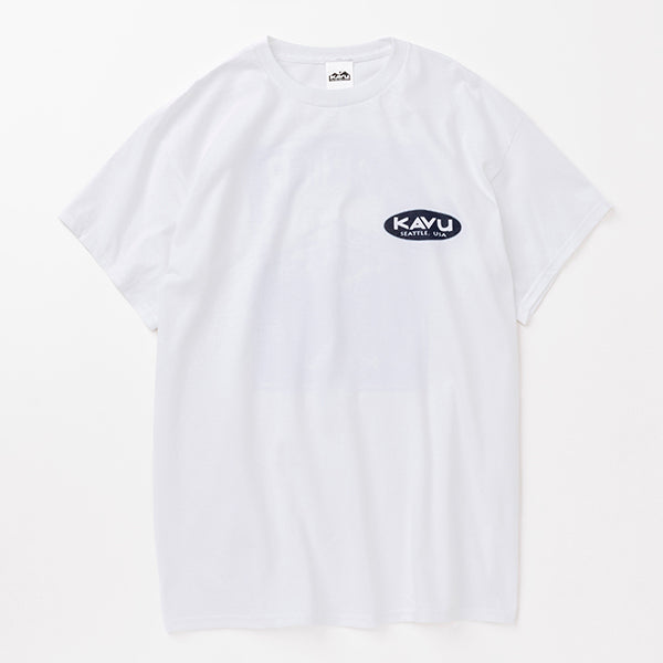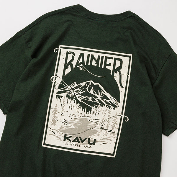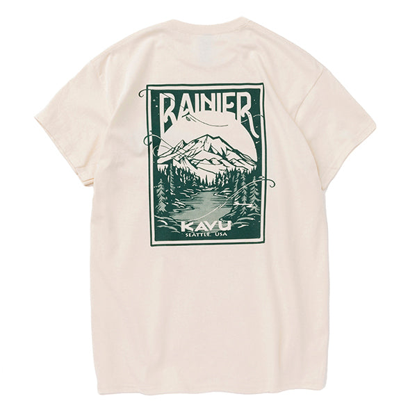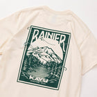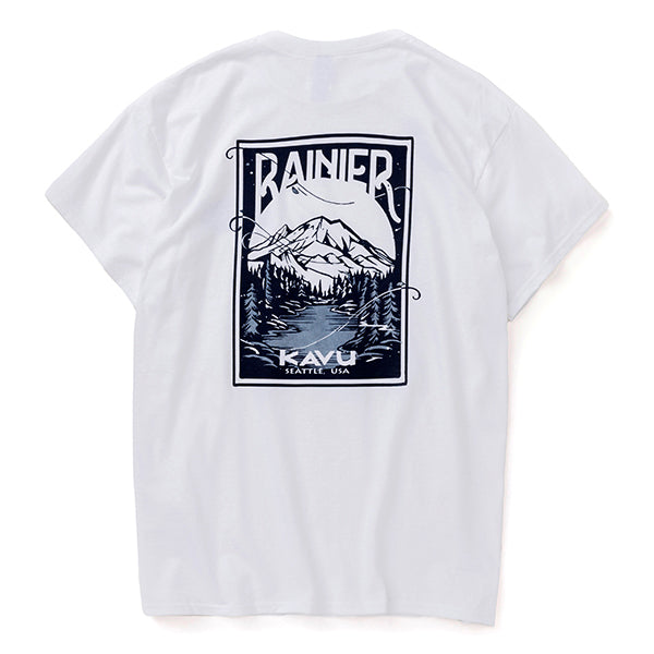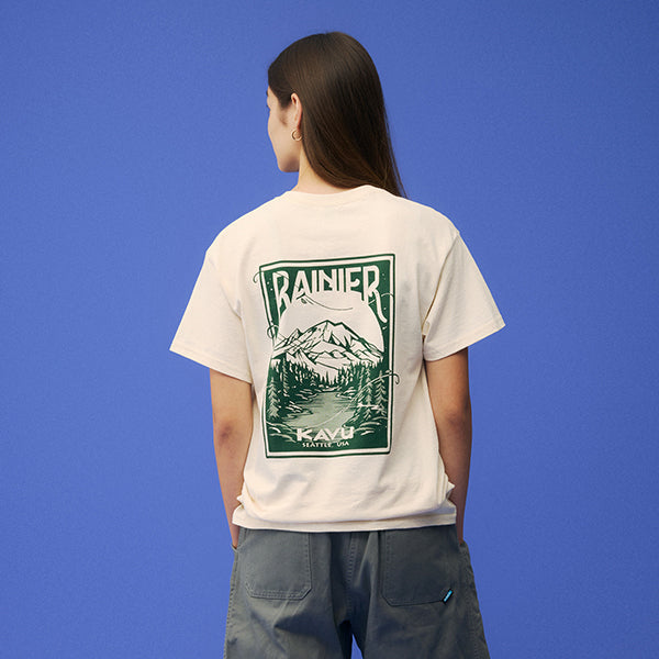 バックプリントにはMt.Rainierが描かれています。Mt.RainierはKAVUの故郷であるシアトルの象徴ともいえる山です。標高4,392メートルを誇るこの山は、アメリカ本土の中でも最も高い火山の一つで、その堂々たる姿は地元の人々や訪れる旅人たちに感動を与え続けています。四季折々の美しい自然に囲まれ、登山やハイキングなどのアウトドアアクティビティの聖地としても知られています。