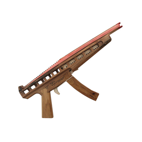 elastic precision エラスティックプレシジョンH&K MP5 ゴム銃はオーク材で作られた精密なゴム銃です。アメリカでは銃を人に向け威嚇しただけで罪になります。常日頃からこうしたゴム銃で遊ぶことが銃の取り扱いに慣れることと銃を所持するマナーを養うために役立っています。サイズは忠実に作られているので、本物の手応えを感じられます。