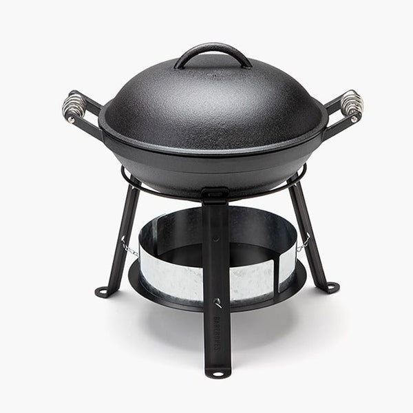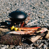 Barebones ベアボーンズ アウトドアアイアンオーブンは鋳鉄製の台座とドーム型の蓋、焼き網、ベーキングスチール、三脚スタンド、石炭トレイを組み合わせて野外での食事の選択肢を広げ、持ち運びを最小限に抑えるために1つに纏めて収納することができるクッカーです。
