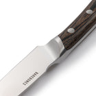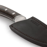 フルタング鍛造ステンレス鋼の刃はドイツグレードで、強く、高い耐久性があります。親指と指のためのブレードノッチにより、スライス、ダイシング、ミンチをする際にプロフェッショナルなグリップができ、コントロール、正確さを実現します。ハンドルは重みがあり、バランスのとれたパッカウッド製です。付属のシースは実際の使用に耐えうるよう、刃を保護します。革素材は時間が経つにつれて柔らかくなり、美しく滑らかな色合いになります。
