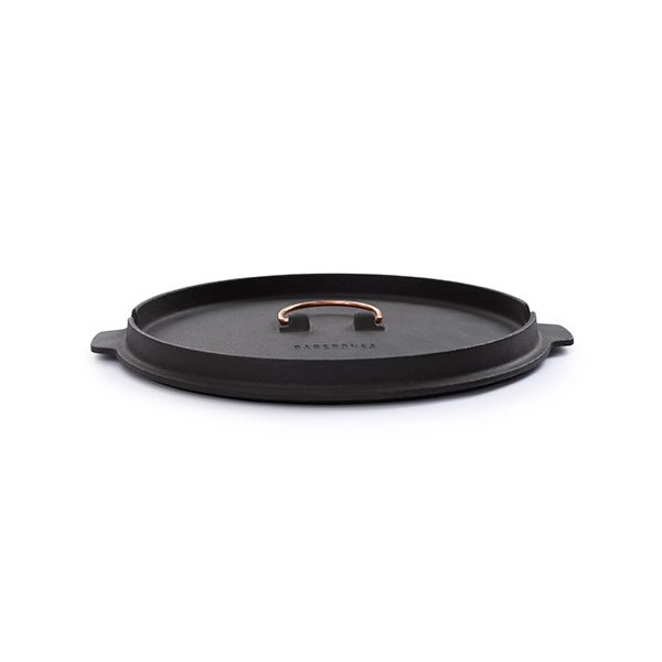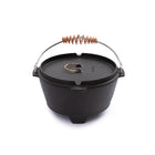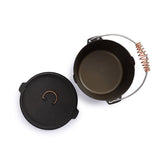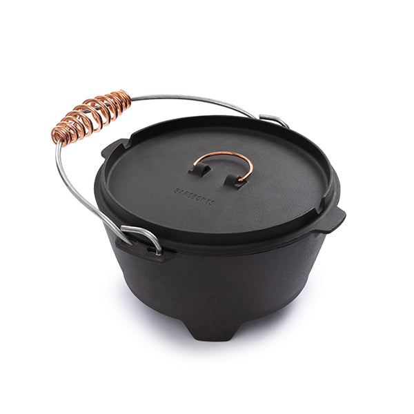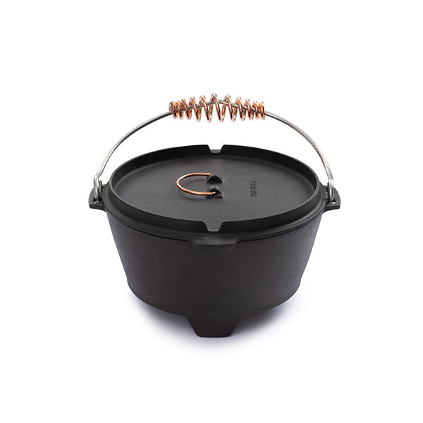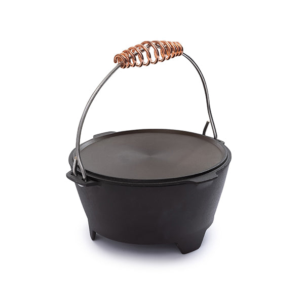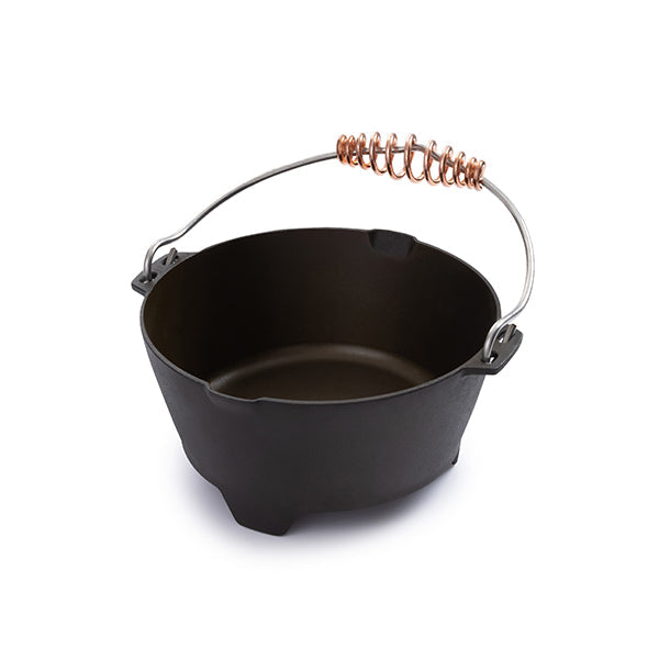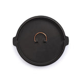 鋳鉄製のダッチオーブンは厚みのある鍋で蓄熱性が高く、いつものお料理がワンランクアップする、素晴らしい調理器具です。直火調理の主役、当然、炭、薪、ガスコンロどの燃料でも使用いただけます。蓋は、裏返してフライパンとしても使用可能です。内側の緩やかなカーブでフラットな鍋底で炒める、蒸す、焼く、マルチに使っていただけます。長いハンドル、純銅のアクセントは、ヴィンテージな艶と相まって、まさにプレミアム。シーズニング済みで、箱から出してすぐに使えます。