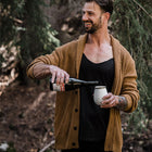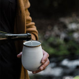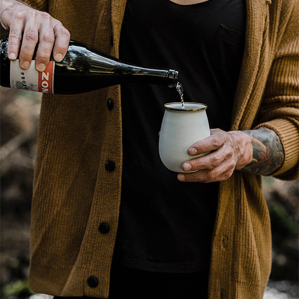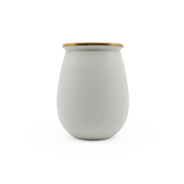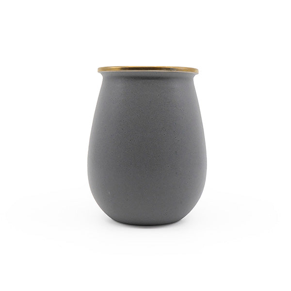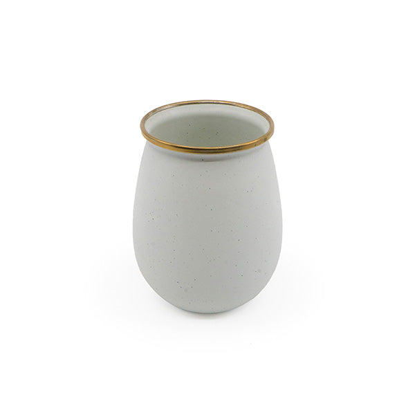 リムはステンレススチールで補強されており、アンティーク調の落ち着いた仕上げになっています。手に収まる丸いフォルムでワインやフレーバーアイスティーなどを楽しむのに最適な、洗練されたデザインです。