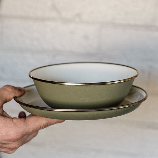 ※エナメルウェアのリムは熱処理され、ブロンズのような緑青仕上げが施されています。プレートの表面と縁は、レモンなどの酸性の食品や、強力な洗剤やクレンザーによって、その独特の色が剥がれてしまうことがあります。