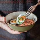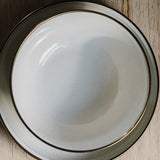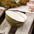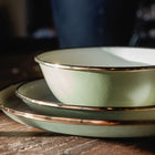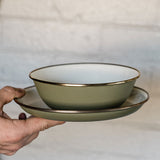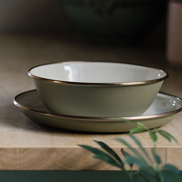 内側は滑らかで斑点のあるヴィンテージホワイト、外側は洗練されたオリーブドラブのマットな質感で、別売りのボウルやカップと組み合わせてお使いいただくのもおすすめです。
