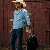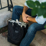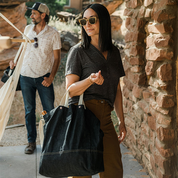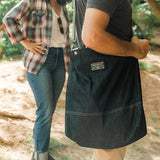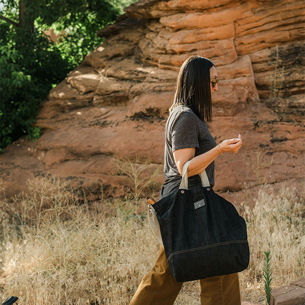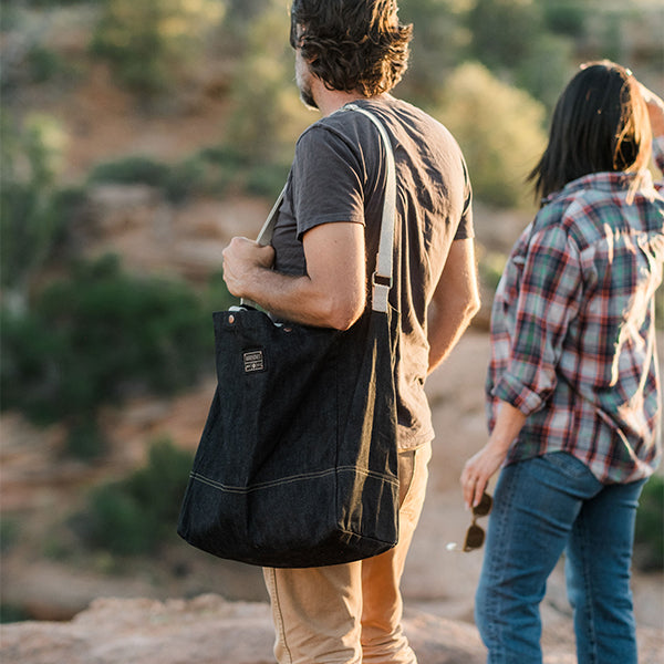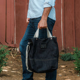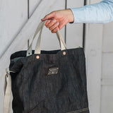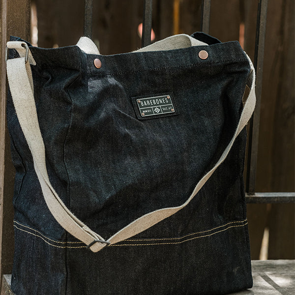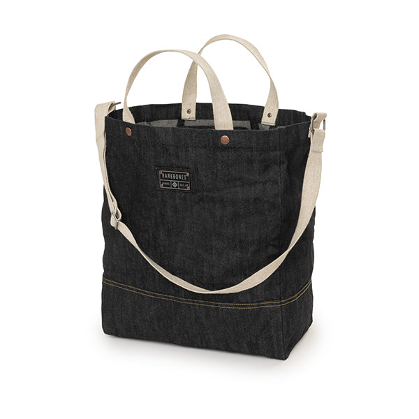 Barebones ベアボーンズ ニーラムオーバーサイズトート デニムは耐久性に優れた、深みのある豊かなブルーのワックスコーティングを施した丈夫なデニム生地で作られた、シンプルで頑丈なトートバッグです。