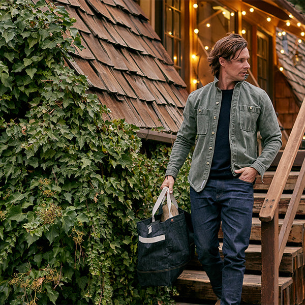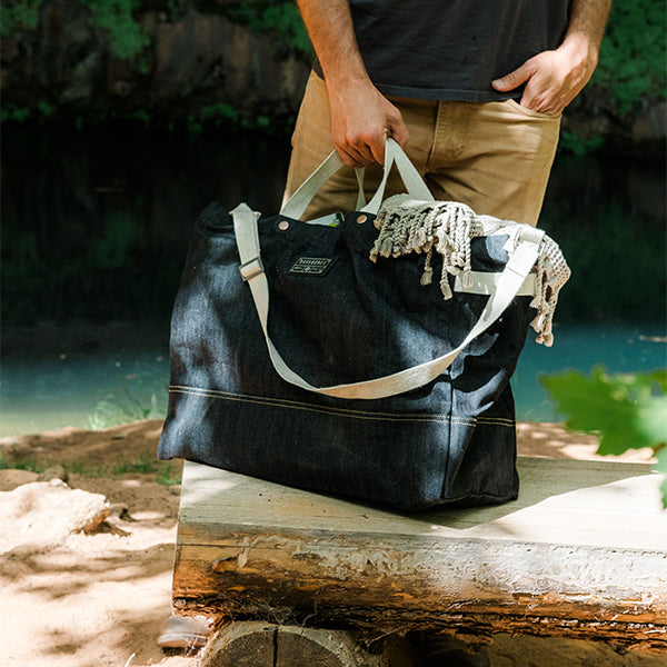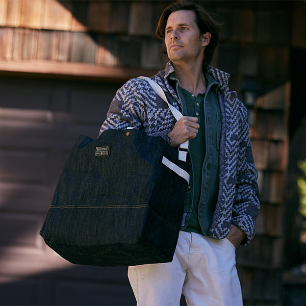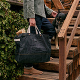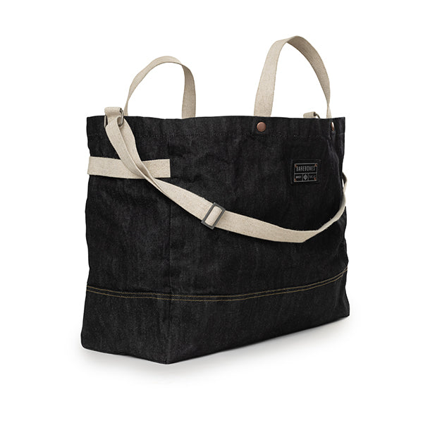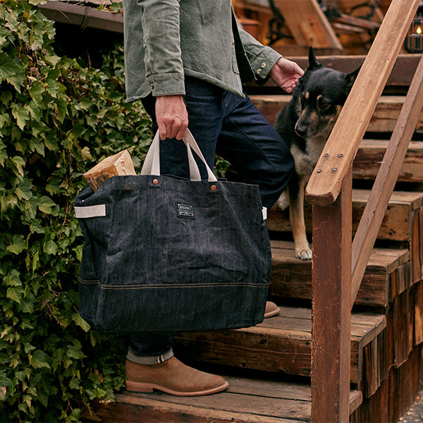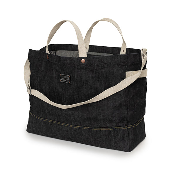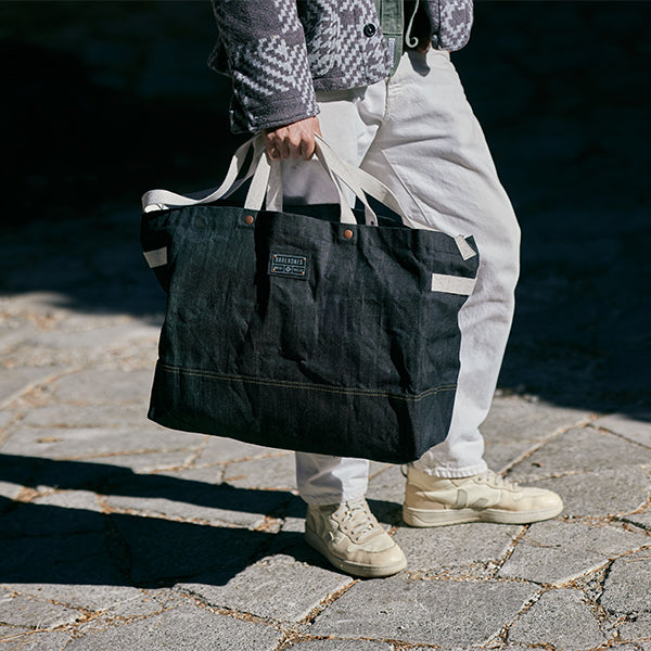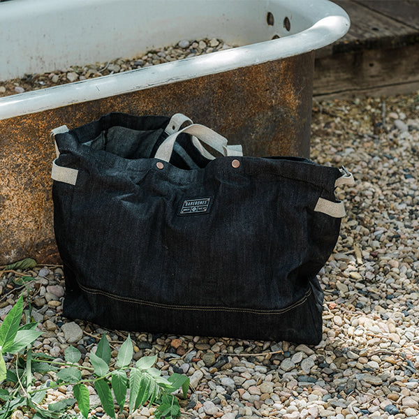 Barebones ベアボーンズ ニーラム ジャイアントトート デニムは耐久性に優れた、深みのある豊かなブルーのワックスコーティングを施した丈夫なデニム生地で作られた、シンプルで頑丈な特大のキャリーオールトートバッグです。