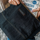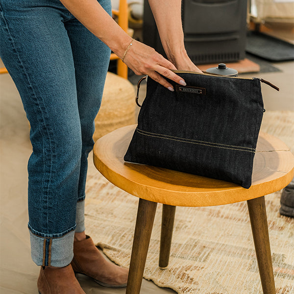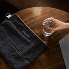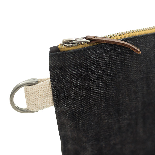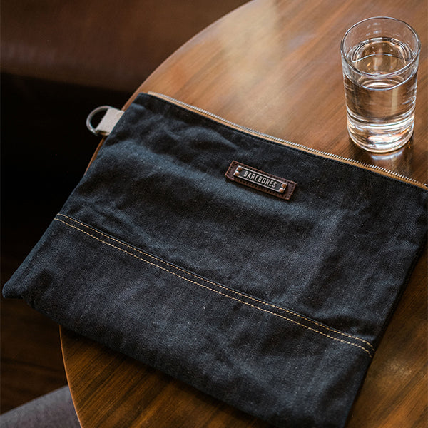 Barebones ベアボーンズ ニーラムラージジッパーポーチ カーキは、深みのある豊かなブルーの色合いが特徴の、ワックスコーティングを施した丈夫なデニム生地で作られたジッパーポーチです。