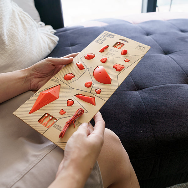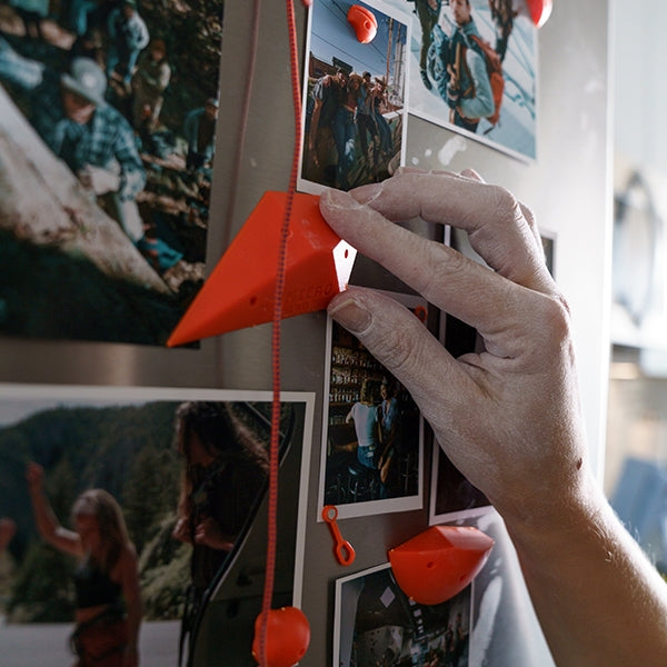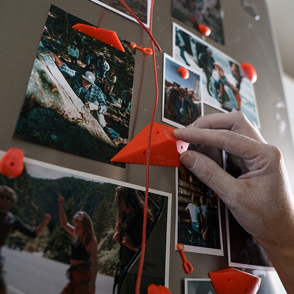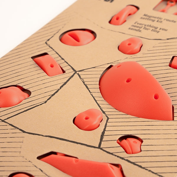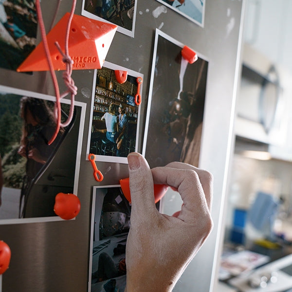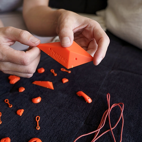パッケージから出して、それぞれのパーツをランナーから取り外し、バラバラにして使い始めます。一つひとつのパーツをホールドに見立てて、クライミングジムの課題を視覚化したり、ルートセッティングの練習をしたり、あるいは冷蔵庫に貼るためのマグネットとして使ったり。マイクロセンドを使ってホームウォールと人生にアソビゴコロを。
