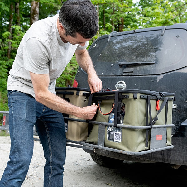 RUX ボックス 70L は大切なギアを収納でき、バックパックのように運搬できる新しいオールインワン・ギアシステムです。