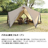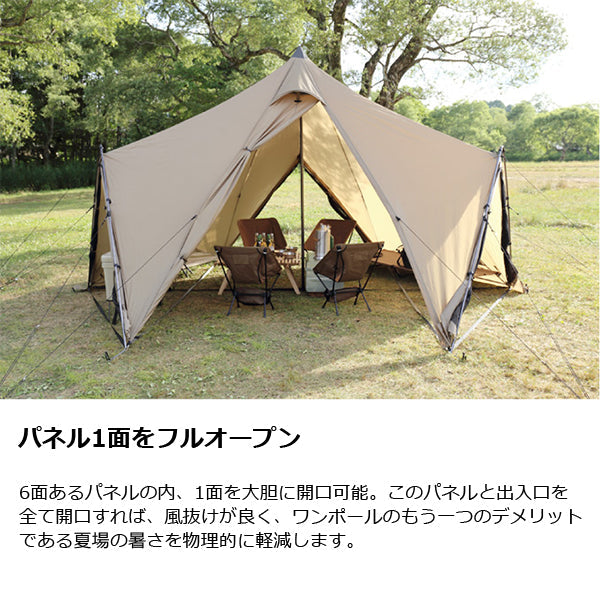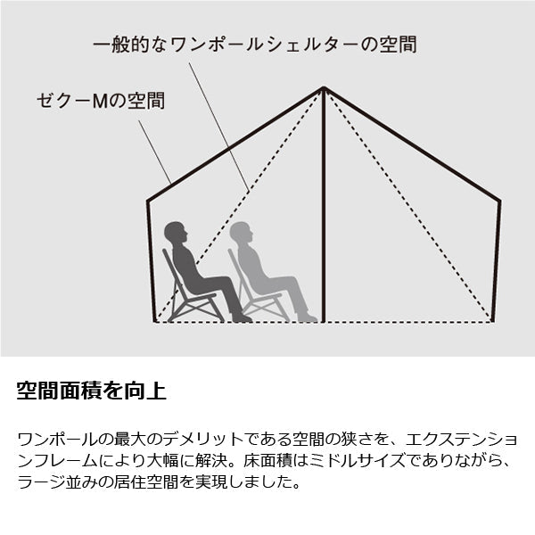 ZANE ARTS ゼインアーツ ゼクーM PS-003はエクステンションフレームで生まれる広い空間と大胆に開口するパネルでワンポールのデメリットを解消したミドルサイズシェルターです。