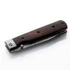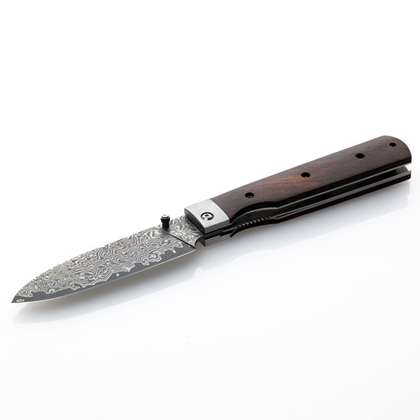 持ち運びに便利、さらに片手で素早くブレードを展開できるライナーロック式で、それぞれの手のひらに収まる大きさで使いやすく、それぞれの料理に対応できるようになっています。ハンドルは硬くて耐久性に優れるココボロ、ブレードはダマスカス鋼(70層)、芯材に錆びにくい8CR14movステンレスを採用しています。