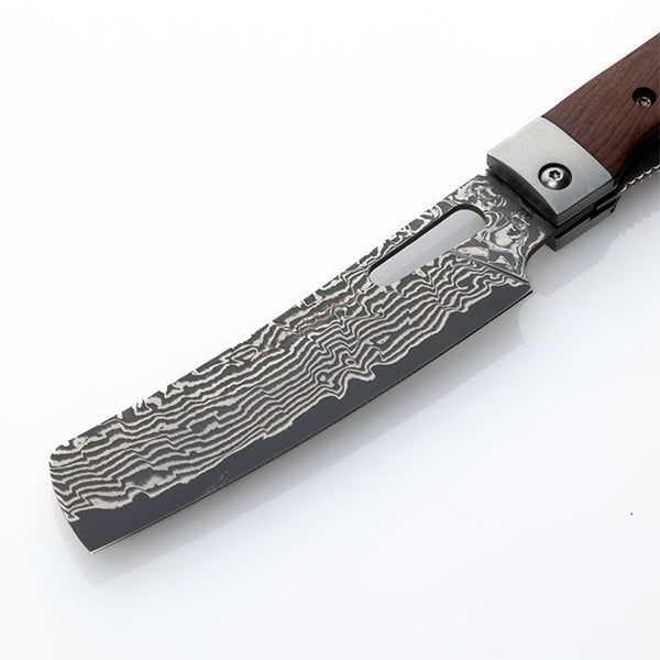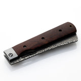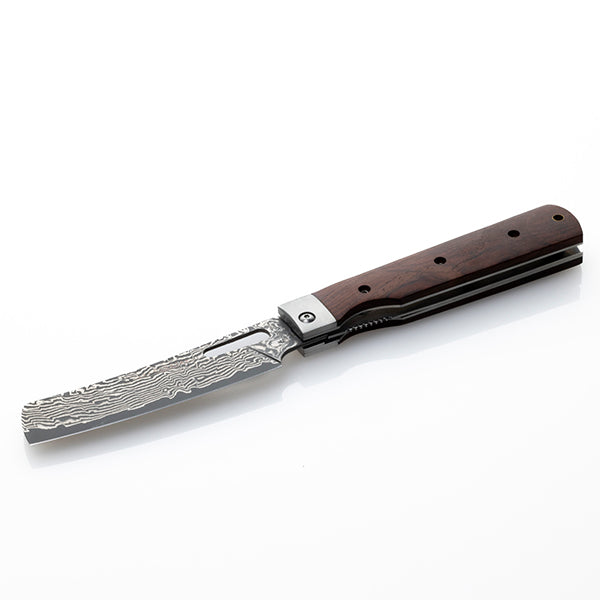 持ち運びに便利、さらに片手で素早くブレードを展開できるライナーロック式で、それぞれの手のひらに収まる大きさで使いやすく、それぞれの料理に対応できるようになっています。ハンドルは硬くて耐久性に優れるココボロ、ブレードはダマスカス鋼(70層)、芯材に錆びにくい8CR14movステンレスを採用しています。