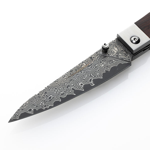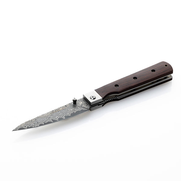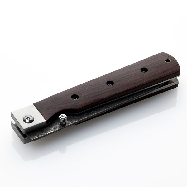 持ち運びに便利、さらに片手で素早くブレードを展開できるライナーロック式で、それぞれの手のひらに収まる大きさで使いやすく、それぞれの料理に対応できるようになっています。ハンドルは硬くて耐久性に優れるココボロ、ブレードはダマスカス鋼(70層)、芯材に錆びにくい8CR14movステンレスを採用しています。