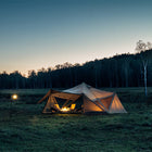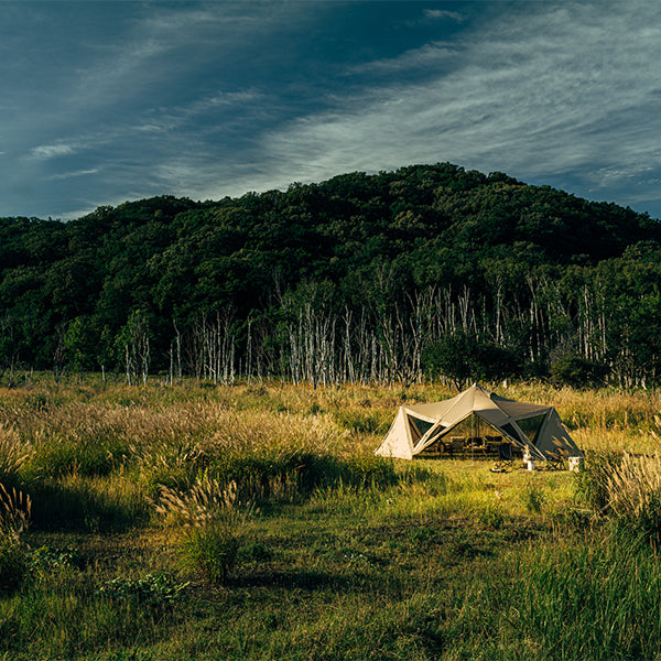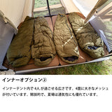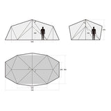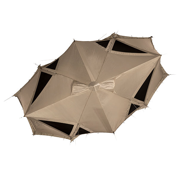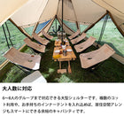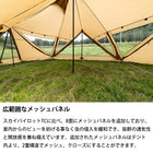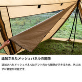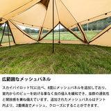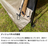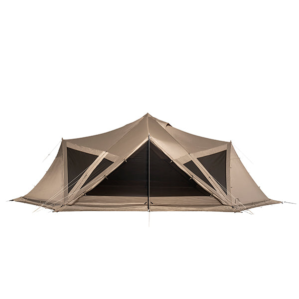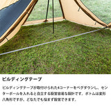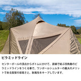 省スペース設計でありながら、サブポールを用いることでデットスペースを無くし、空間を最大限に確保した大型シェルターです。TC素材に比べ軽量でコンパクト、防水仕様となり、メンテナンスが簡単で、設営・撤収も容易で誰にでも取り扱いやすいモデルです。