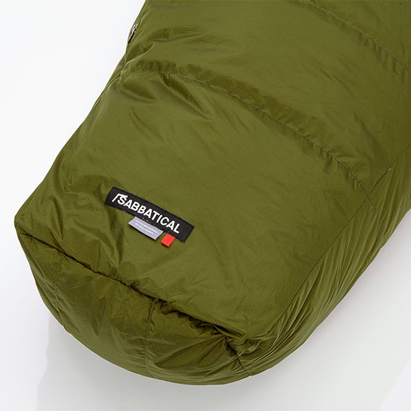 SABBATICAL サバティカル オーロラ900DX グラスグリーン レギュラーは表地に40Dの丈夫な防水透湿素材オーロラテックスを採用し、760フィルパワーの高品質なダウンを採用したシュラフカバーの要らないオールラウンドな立体構造の寝袋です。キャンプでの快適性を考え、体の動きを妨げないオリジナルカッティングパターンで寝返りや、寝袋に入った状態でも寛ぎやすい仕様です。ダウンバッグSTDより生地が厚く、ダウンのフィルパワーが高い為、保温力が高くなっております。レギュラーサイズは身長183cmまで、ショートサイズは身長165cmまでのサイズです。小柄な方はショートサイズを選んでいただけますと寝袋本来の性能をしっかり発揮できますので、サイズ選びは重要なポイントです。オーロラ900DXは4シーズンで対応可能で、厳冬期の雪中や高所登山でも使用できるスペックのモデルですので、寒がりな方にも最適です。サバティカルでは最も保温力の高いモデルとなります。