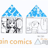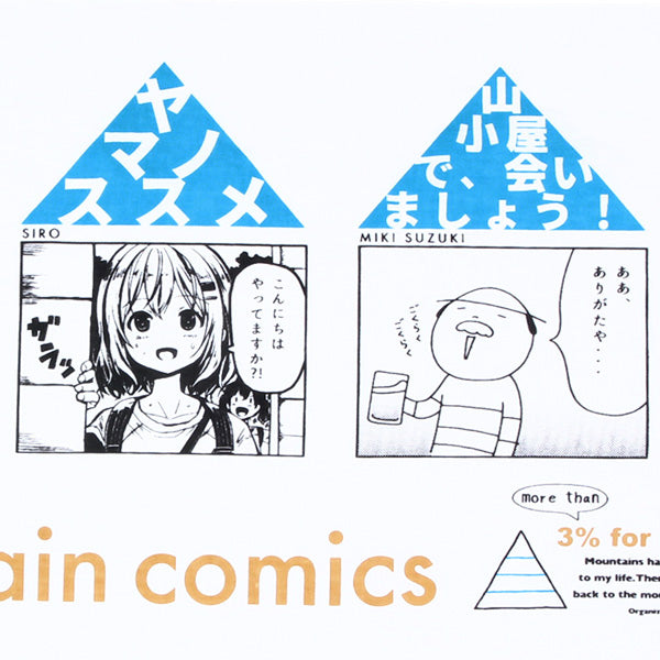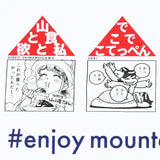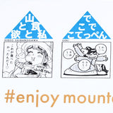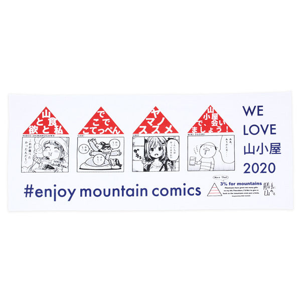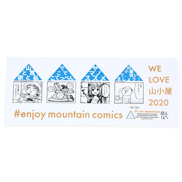 山小屋支援手ぬぐいは、山をテーマに漫画を描いている4人の作家、信濃川日出雄(山と食欲と私)、ゲキ(でこでこてっぺん)、しろ(ヤマノススメ)、鈴木みき(悩んだときは山に行け!)の描き下ろしコラボ手ぬぐいです。